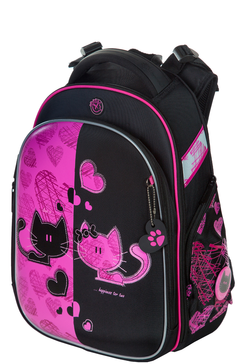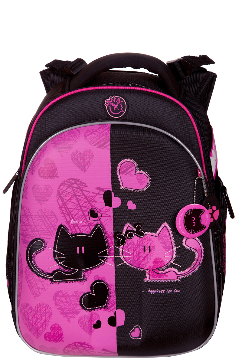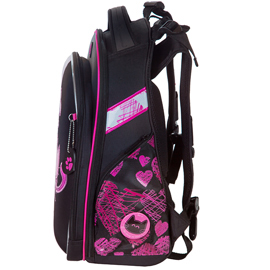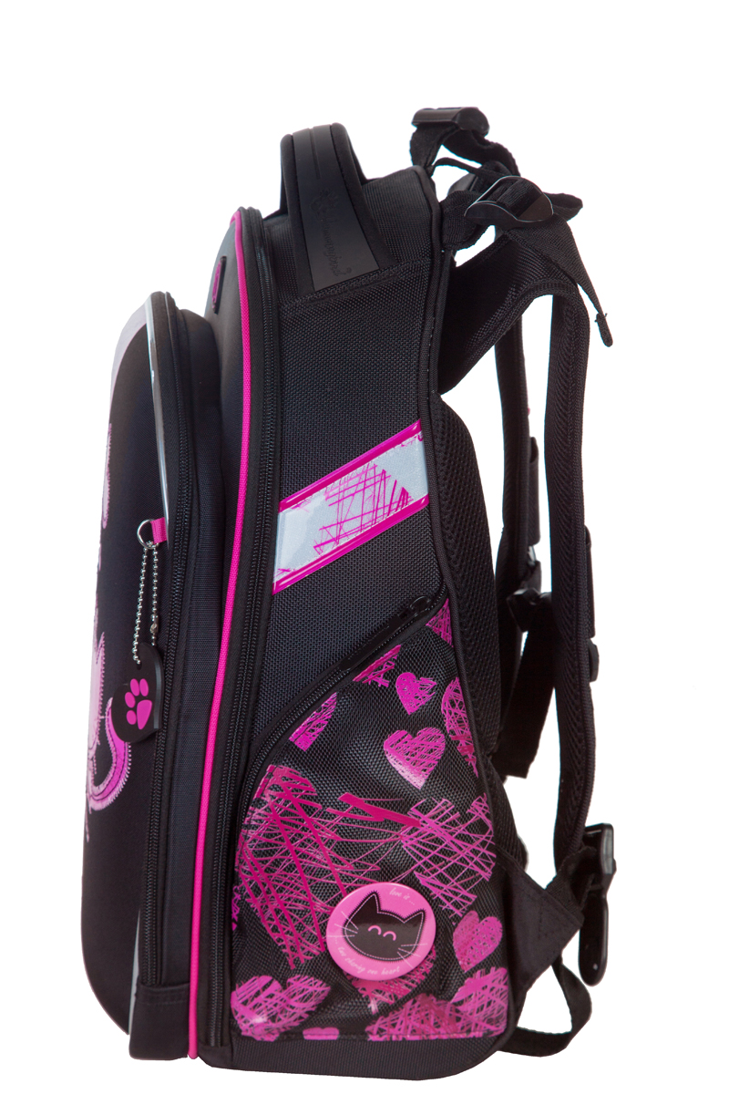 - два больших отделения на молниях. В основном, самом большом отделении расположены жесткие перемычки- вставки, для комфортного размещения тетрадей или учебников. В переднем отделении предусмотрен органайзер с карманом для мобильного телефона, сетчатым карманом для мелочей, отделениями для ручек и карандашей, подвеской для ключей.