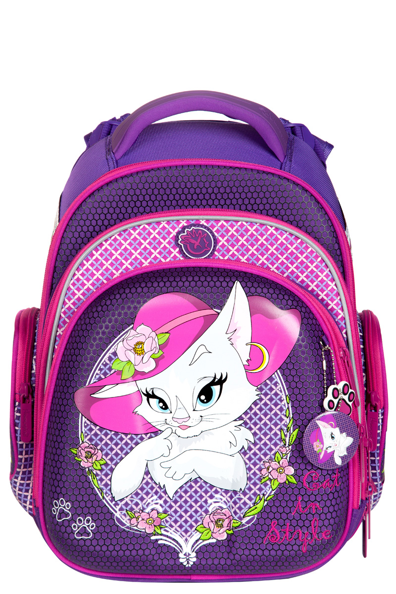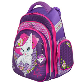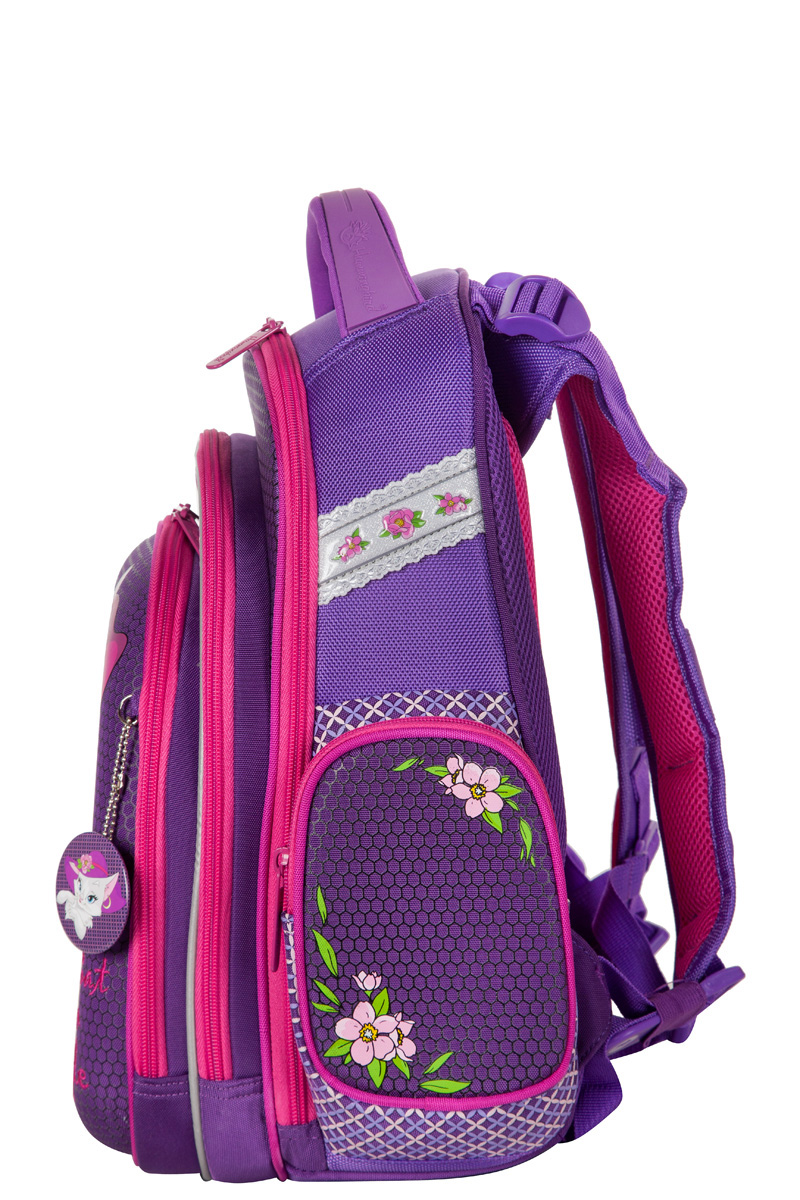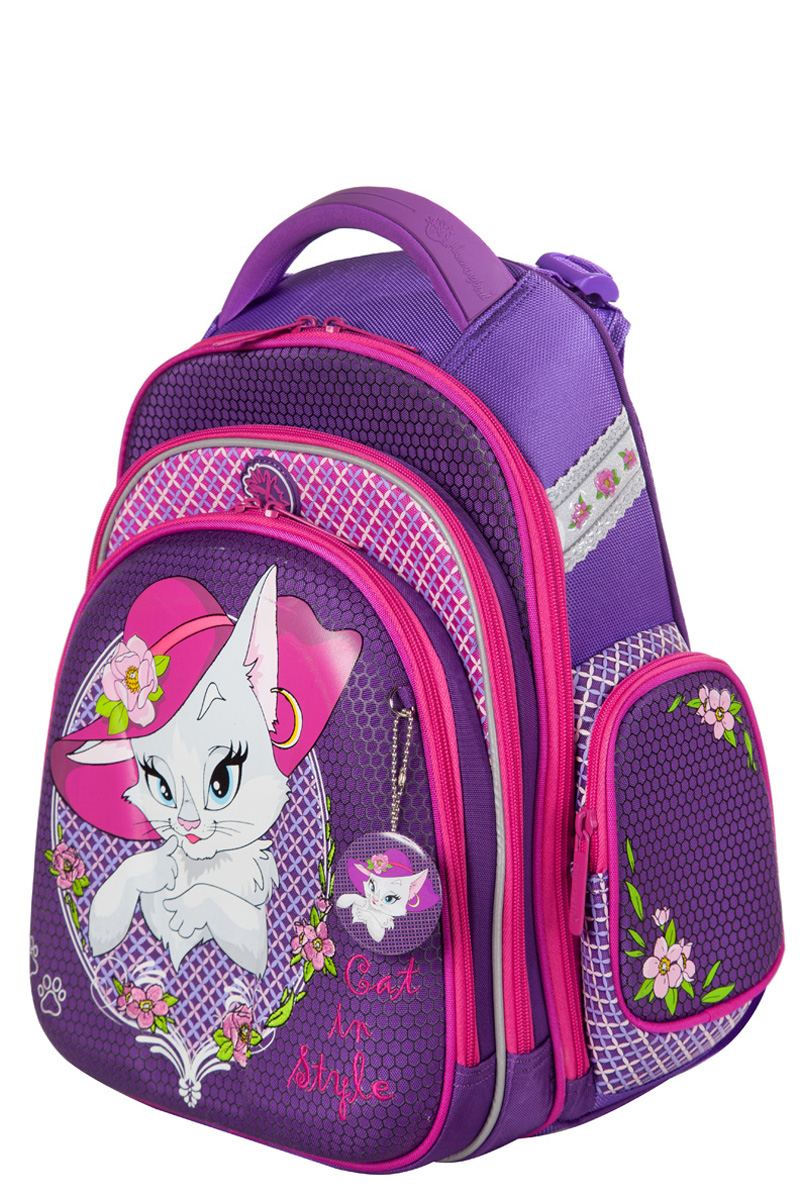 - два больших отделения на молниях. В основном, самом большом отделении расположены жесткие перемычки- вставки, для комфортного размещения тетрадей или учебников. В переднем отделении предусмотрен органайзер с карманом для мобильного телефона, сетчатым карманом для мелочей, отделениями для ручек и карандашей, подвеской для ключей.