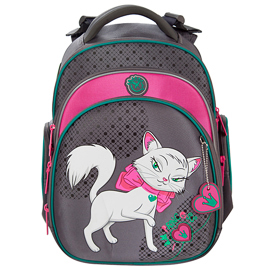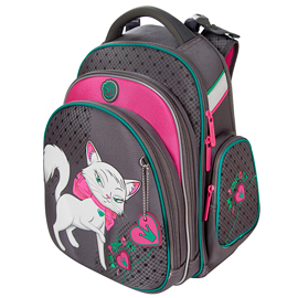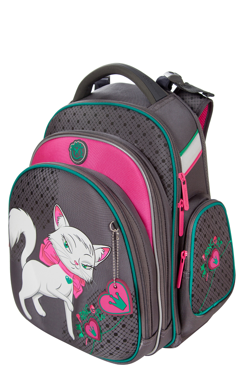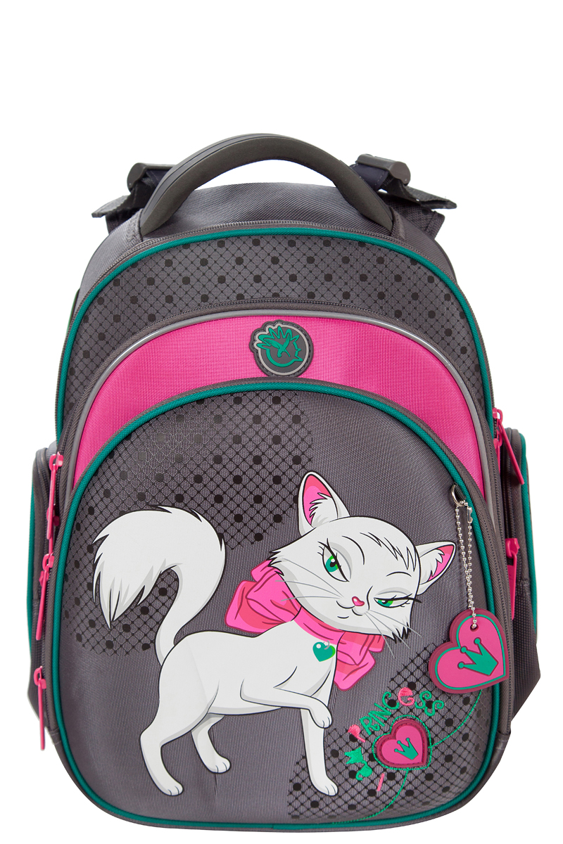 - два больших отделения на молниях. В основном, самом большом отделении расположены жесткие перемычки- вставки, для комфортного размещения тетрадей или учебников. В переднем отделении предусмотрен органайзер с карманом для мобильного телефона, сетчатым карманом для мелочей, отделениями для ручек и карандашей, подвеской для ключей.