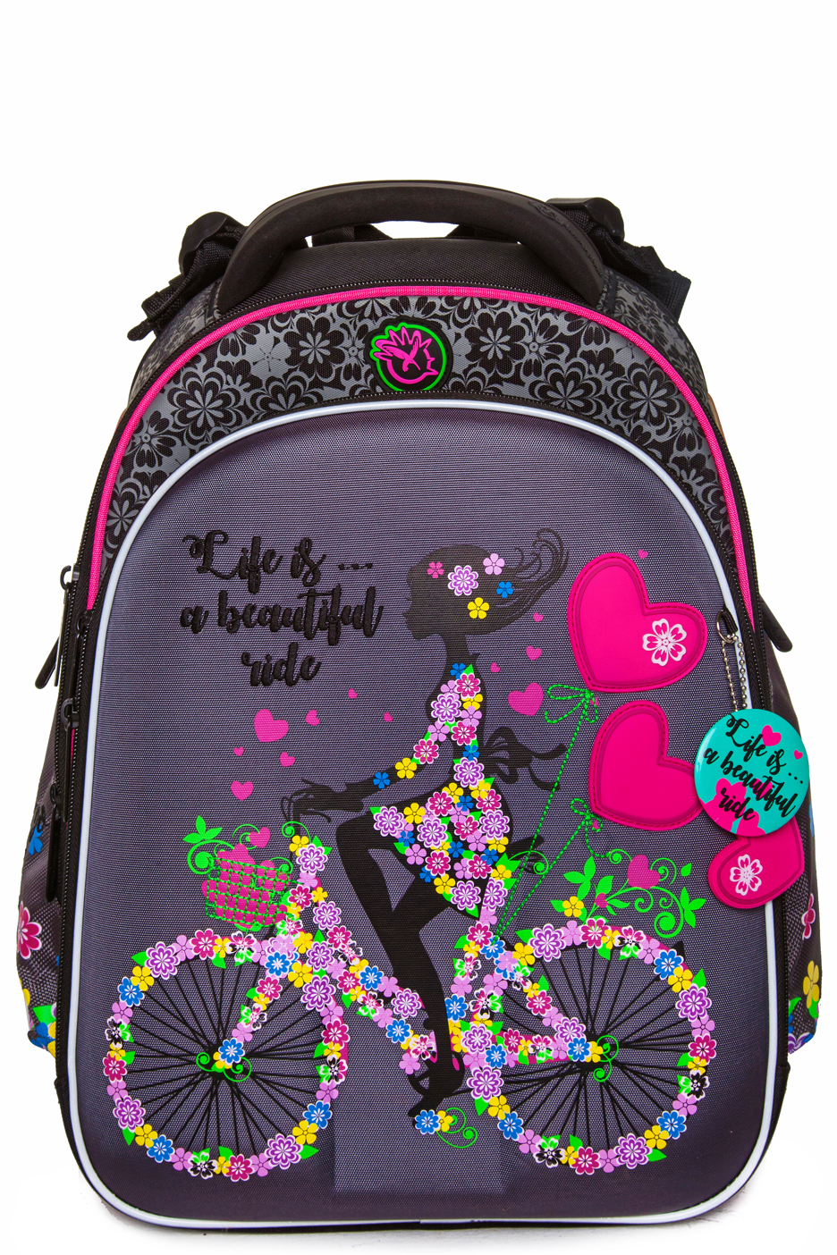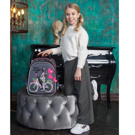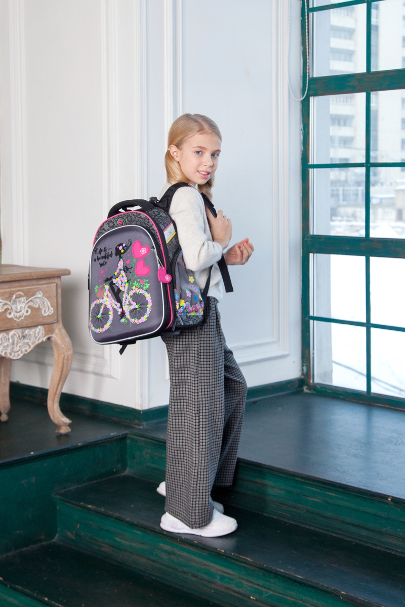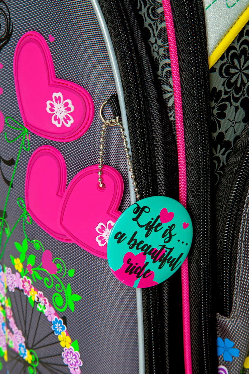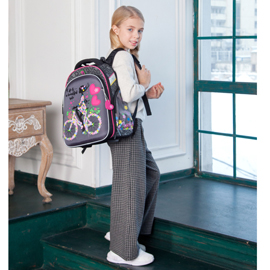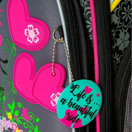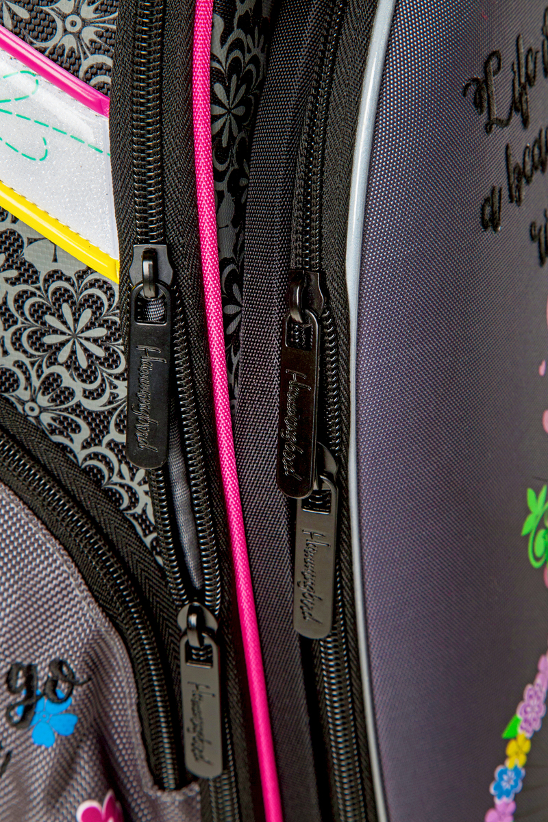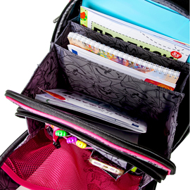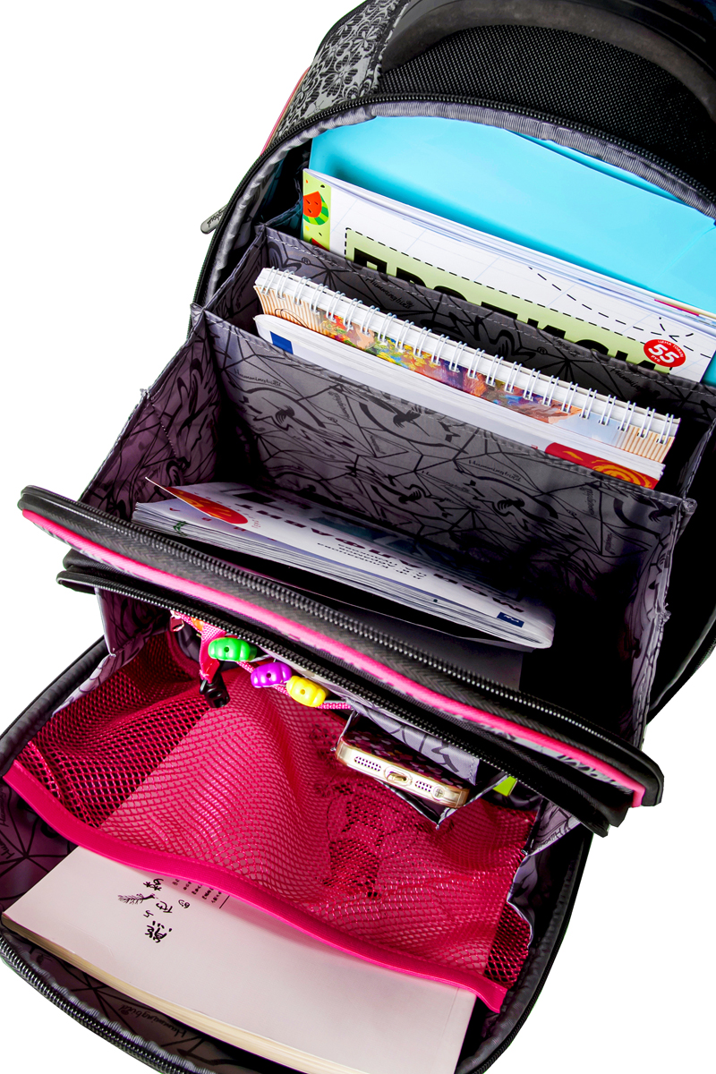 - три больших отделения на молниях. В основном, самом большом отделении расположены жесткие перемычки- вставки, для комфортного размещения тетрадей или учебников. В переднем отделении предусмотрен органайзер с карманом для мобильного телефона, сетчатым карманом для мелочей, отделениями для ручек и карандашей, подвеской для ключей.
