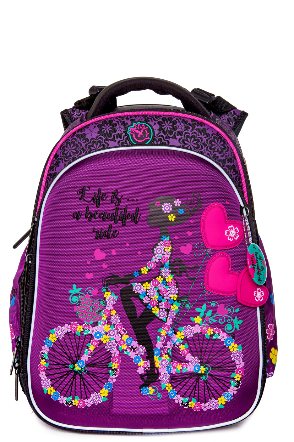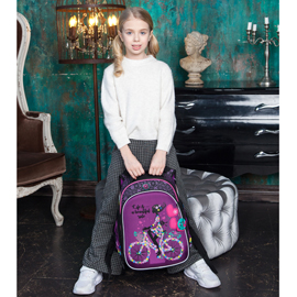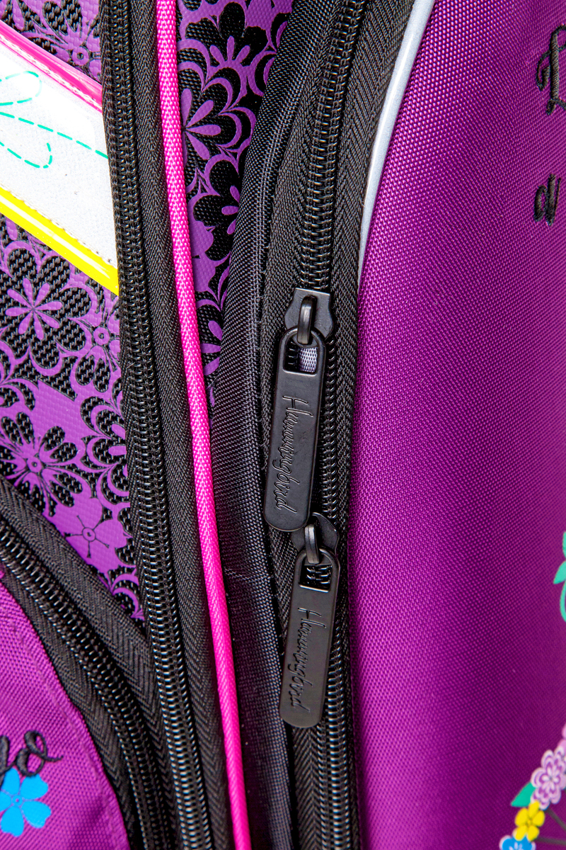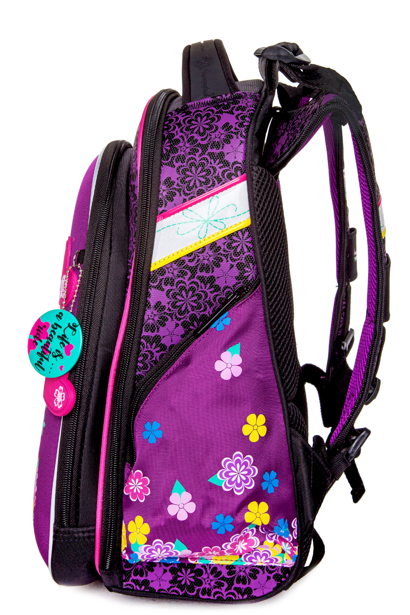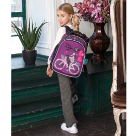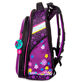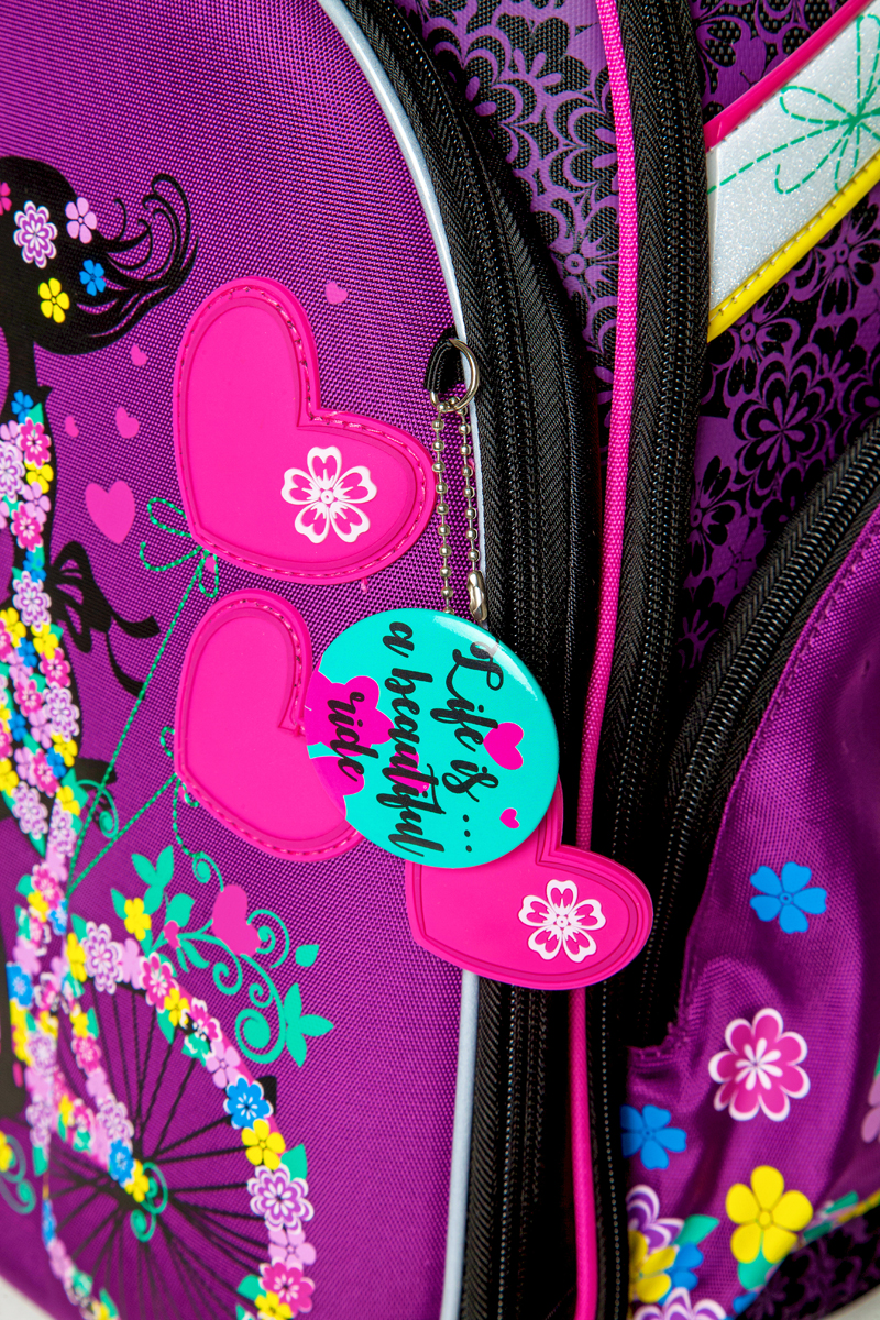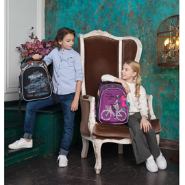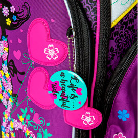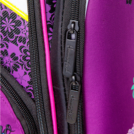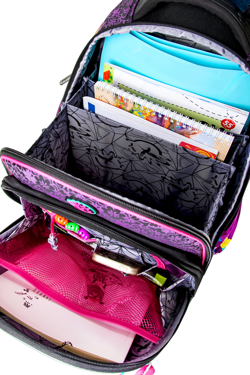 - три больших отделения на молниях. В основном, самом большом отделении расположены жесткие перемычки- вставки, для комфортного размещения тетрадей или учебников. В переднем отделении предусмотрен органайзер с карманом для мобильного телефона, сетчатым карманом для мелочей, отделениями для ручек и карандашей, подвеской для ключей.