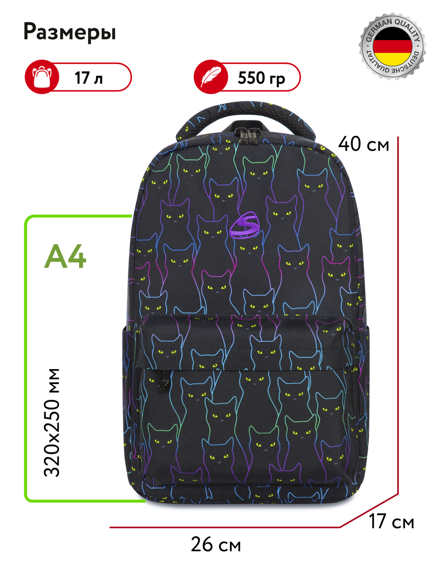 Комплектация: два больших вместительных отделения для тетрадей, учебников, папки для труда (папки формата а4) или компьютера (ноутбука, планшета). Переднее отделение с удобным многофункциональным органайзером, кармашком для мобильного телефона, карабином для ключей, а также сетчатым карманом для других школьных принадлежностей в школу. По бокам расположены удобные и большие карманы для бутылки с водой и мелочи для школы и других предметов.