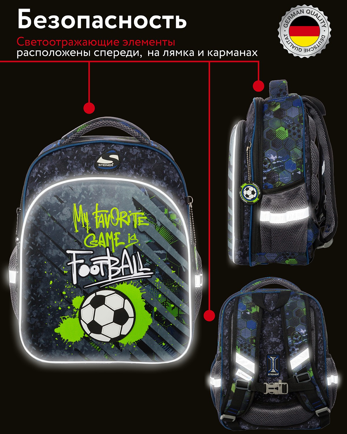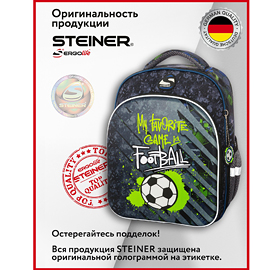Также рюкзак с анатомической спинкой имеет высокочеткий и яркий 3д рисунок, который максимально устойчив к жаре и холоду; качественные резиновые 3D нашивки; прочную фирменную ручку для переноски ранца; петлю для подвешивания на школьную парту; качественные молнии фирмы "SBS, а также эксклюзивную подкладку Steiner. Все швы прошиты дополнительными цветными прострочками, которые в разы увеличивают прочность ранца школьного. Наружная поверхность рюкзака выполнена из специальной водоотталкивающей ткани «OXFORD 600» препятствующей его загрязнению. По всему периметру детского ортопедического рюкзака расположены светоотражающие элементы - вставки, позволяющие ребенку быть заметным на дороге в тёмное время суток.