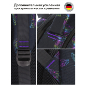 Комплектация: два больших вместительных отделения для тетрадей, учебников, папки для труда (папки формата а4) или компьютера (ноутбука, планшета). Переднее отделение с удобным многофункциональным органайзером, кармашком для мобильного телефона, карабином для ключей, а также сетчатым карманом для других школьных принадлежностей в школу. По бокам расположены удобные и большие карманы для бутылки с водой и мелочи для школы и других предметов.